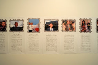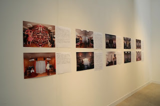 展示される作品には、それぞれ数百字から千字以上になるテキストが添えられ、しかも写真や立体制作物を鑑賞するのと同じ位置で読めるよう、通常の展覧会の感覚からすれば非常識なほど大きな文字組みで、壁のいたるところに貼りつけられています。