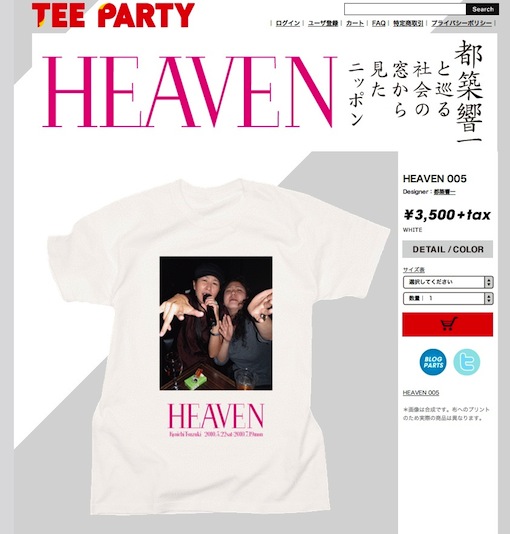 公式TシャツTee Party 5月24日にオープンしたばかりの、ウェブによるオンデマンド・アーティストTシャツ販売サイト、『Tee Party』。すでに99アーティスト、684柄という、とてつもない数のTシャツがアップされていますが、その中で『HEAVEN』と題したブランドを作りました。全67種類! ラブホ家具から広島太郎から珍日本スポットまで、お好みのデザインを、お好みのサイズで着こなしてください!